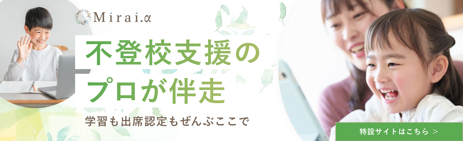 私たちMirai.αは、学校に行かないという選択が、子どもたちの豊かな人生を制限することのない社会を目指し、一人ひとりの未来に「+α」をお届けします。