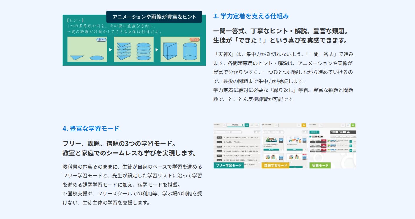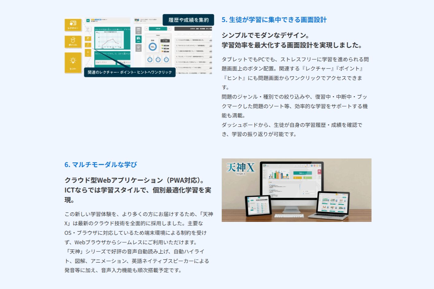 Mirai.αでは、第10回日本e-Learning大賞を受賞した「天神」から新たに発売されたタブレット対応の「天神 X」をICT教材として導入しています。